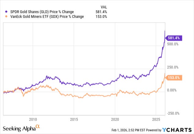 Why use miners as a hedge here? Since the inception of the GDX ETF, gold miners have delivered barely a quarter of the return of just owning the metal itself: