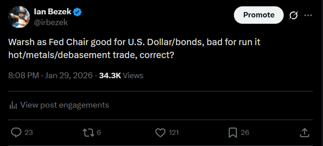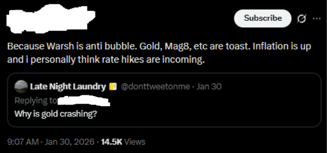 The most common complaint I saw was that metals and crypto shouldn’t have gone down... it’s not like Warsh is going to raise interest rates or anything, so what’s the matter?
